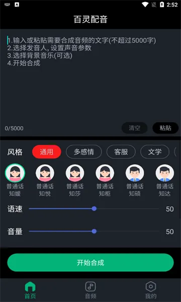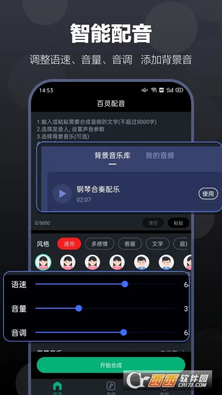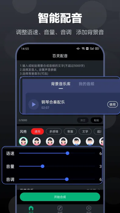 4、操作简便智能配音,操作简单,从专业播音主持到少儿配音,提供丰富发音人选择,还可自由调整语速语调音量等 。
