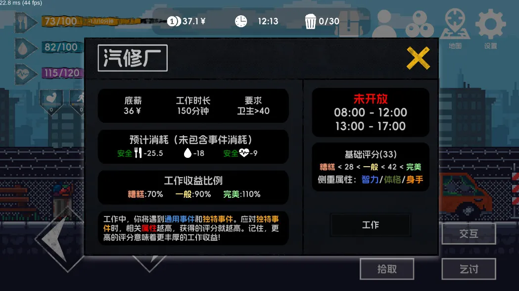 在玩法上,开局只能靠乞讨或捡垃圾换取生活物资,有一定财富后可选择炒股、创业或打工等增加财富。游戏核心玩法围绕资源管理、技能提升和身份进阶。需在拾荒、乞讨、打工等活动中合理分配资源,学习技能提升体格、身手、智力和精神四大核心属性,以适应城市生活,最终摆脱流浪成为公民。