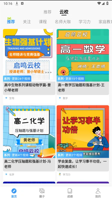 启鸣云校是启鸣达人珠海横琴教育科技有限责任公司打造的家教共育教学平台。通过大数据为学生定制专属计划,补强薄弱环节。有成绩查询、学习记录追踪等功能,分首页、圈子、云校、我的四大板块,助力家校共育与学生成长。