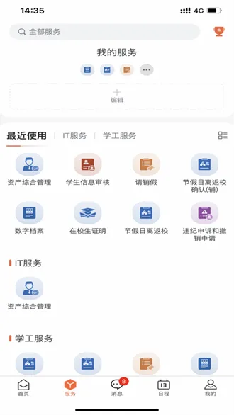 首页涵盖最近使用、新闻公告等内容,方便师生快速获取重要信息。服务板块包含宿舍管理、请假等日常服务,满足生活需求。业务流程清晰展示当前应处理事务。日程安排可合理规划生活学习。我的页面能掌握个人信息与安全设置。