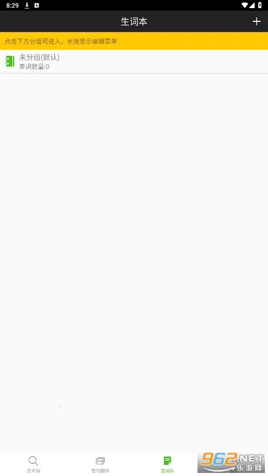 5、最后点击底部的“生词本”,进入单词管理界面,使用右上角的“+”按钮建立新的分组,随时添加想要记忆的新单词,强化记忆效果。
