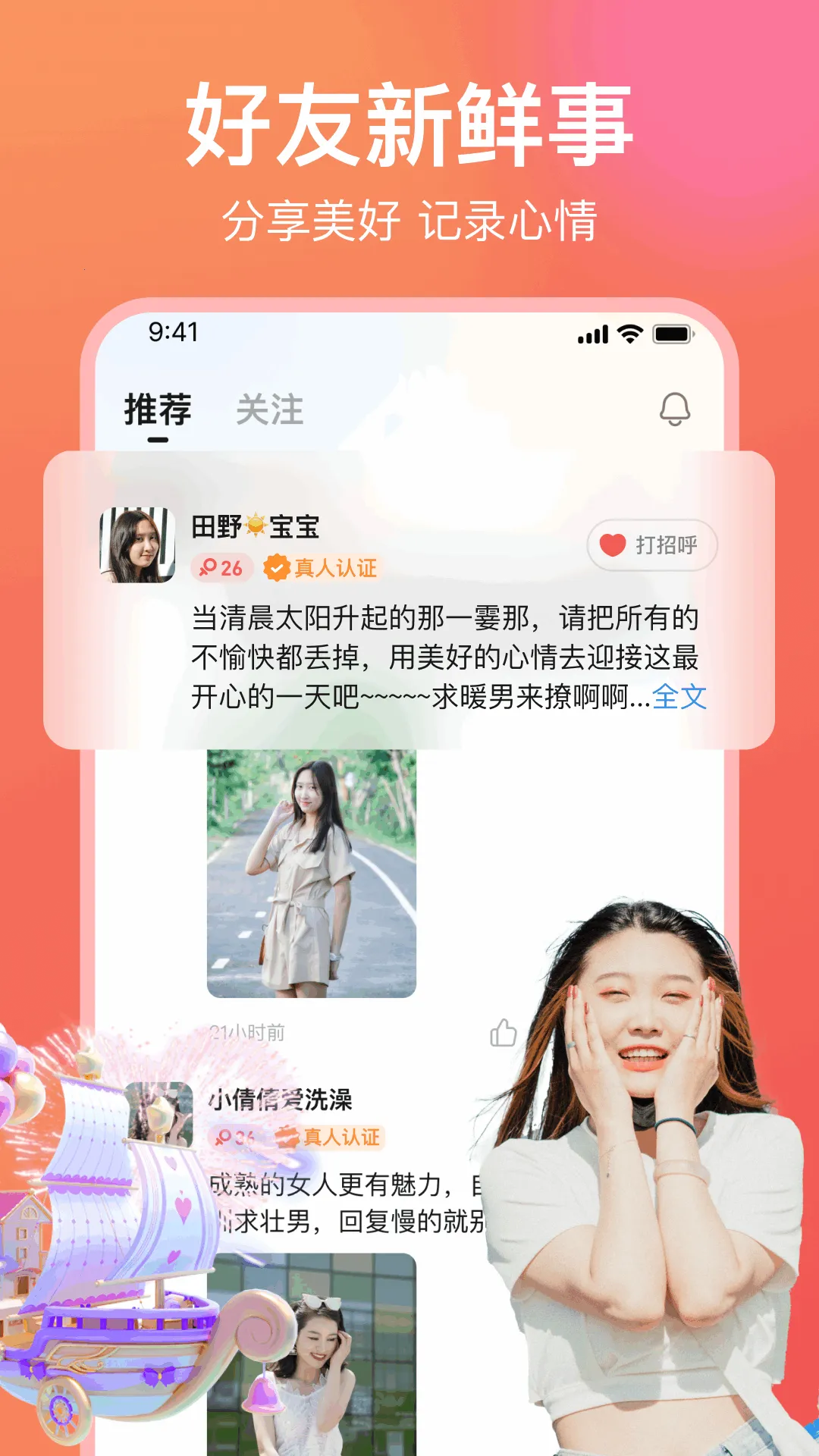 在这里,用户不用担心照骗等问题,能放心交友。其提供的社交服务全面,无论是线上聊天还是线下约会都能满足,能给用户带来一场完美的邂逅之旅,高效结交志同道合的小伙伴。