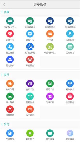 2. 涵盖学习、工作、生活、管理四大版块,为在校师生提供便捷服务,新手能办理入学退学等相关事宜。