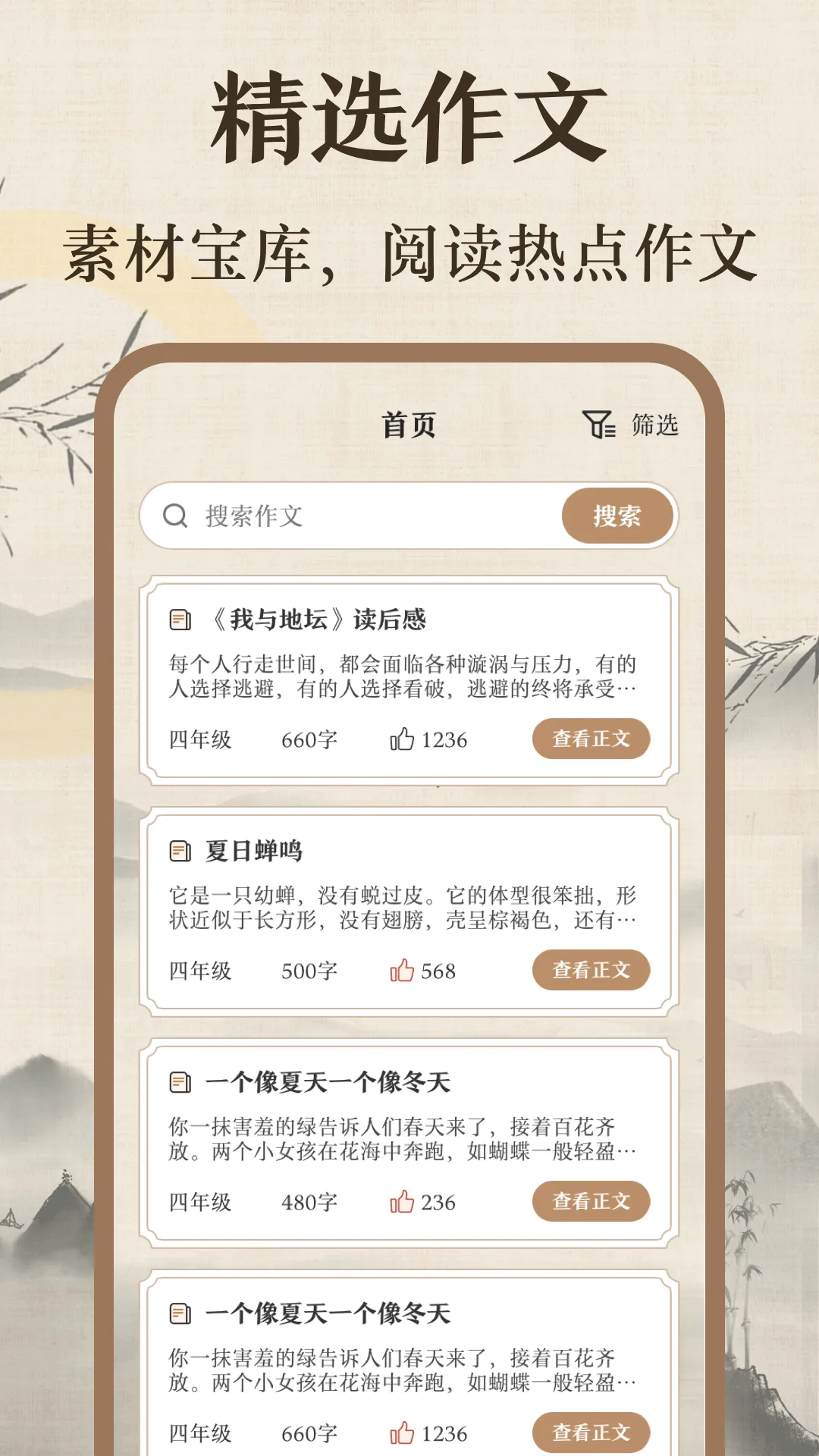 作文宝典app内容丰富,涵盖海量作文素材与优美例句。有精选名校佳作、百题材分类,能助学生提升写作功底,还能查阅经典范文、明确考试标准,更有贴心收藏、作文搜索等功能,免费下载随时学。