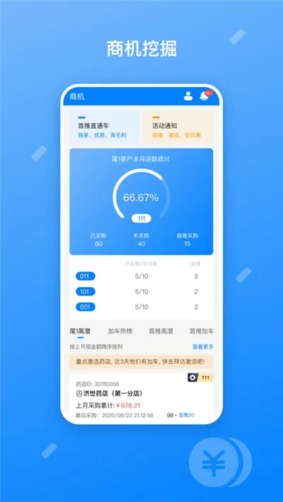 3 销售跟进数据清晰,分类明确,便于随时查看。检索药店快捷灵活准确,活动通知详细。