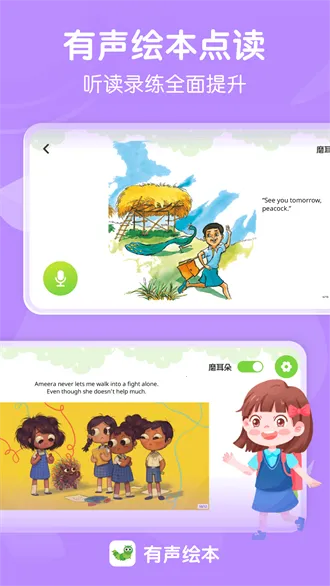 在应用功能上,声画同步无需手动翻页,高清有声绘本可边看边听。内容丰富多样,涵盖多种经典绘本。单本绘本配有多种音频。精品绘本故事专为3至12岁儿童打造,北美专业外教发音生动。智能口语测评支持在线录音,实时反馈口语水平,还有趣味游戏式刷分体验。学习成就勋章奖励能激发孩子学习兴趣和动力,专业阅读报告可视化记录孩子成长进步,助力积累英语词汇。