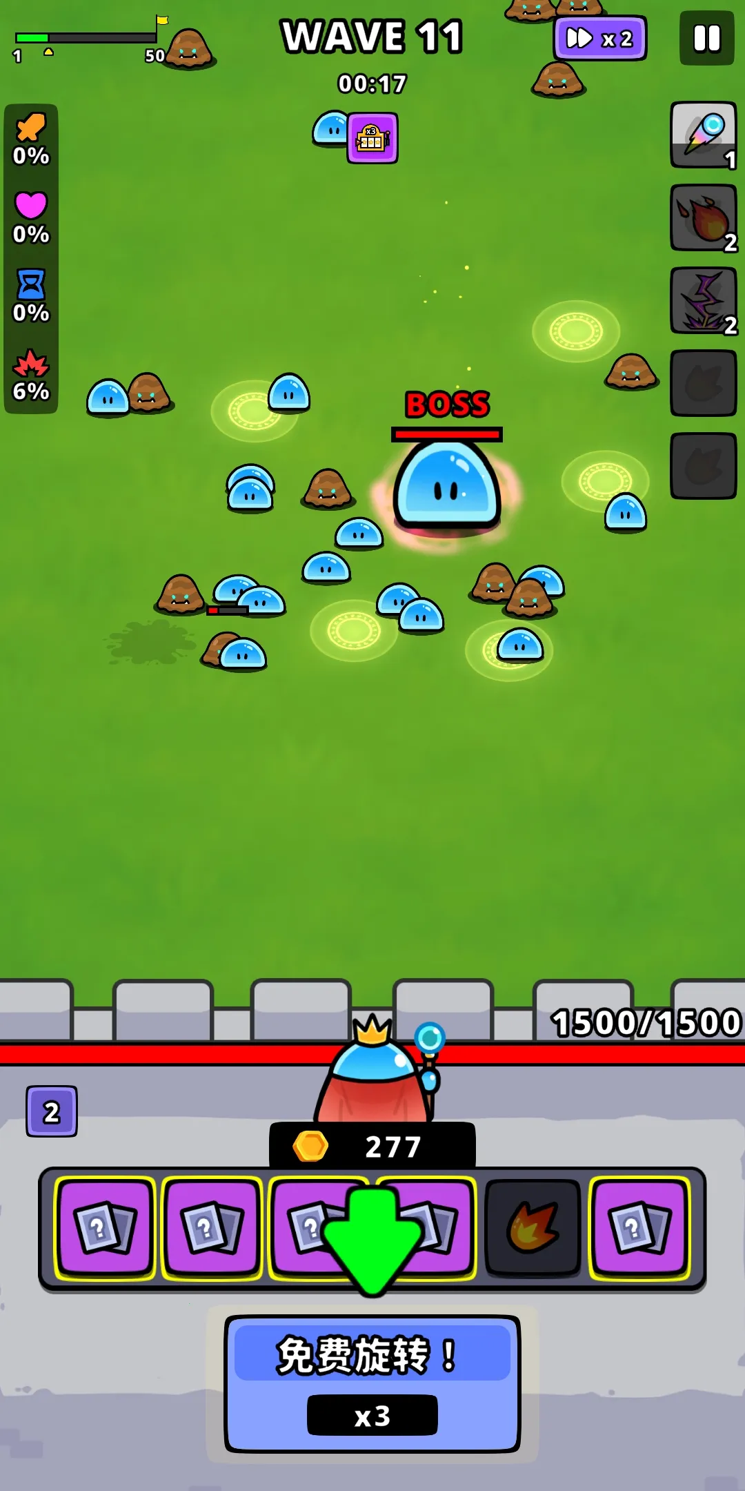 4、城堡守护与波次机制合理,城堡初始血量 500 点,每关 15 波常规魔物,第 15 波后有概率触发隐藏 BOSS 战。波次间隙无部署阶段,技能自动释放,玩家专注转盘选择与技能进化即可。