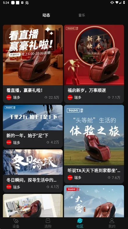 瑞多2025下载是瑞多上海智能科技有限公司研发的智能健康设备管理软件,可连接按摩椅等设备,手机操控,能设置参数、定时档位、按摩模式,有语音控制,还能查看按摩数据、享受音乐文章,商城有精品。
