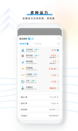 3、运力充足:采取聚合众模式,整合数十家头部配送公司,同城就近甩单,保证接单速度。