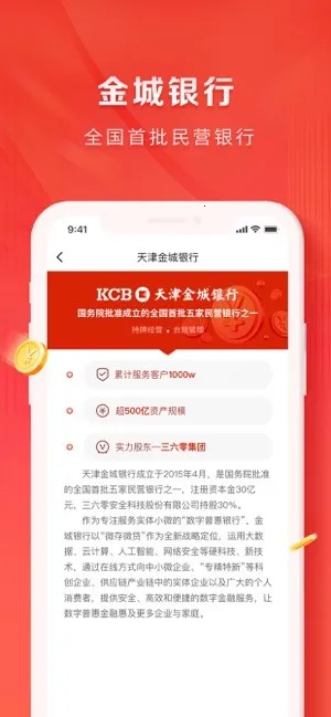 其功能丰富实用。能快速进行存款和转账,业务处理便捷。专享存款产品收益高且支取灵活;线上贷款免抵押担保,随借随还,审批快速。多重校验绑定设备保障资金安全,交互简洁,操作舒心。最新版亮点突出,灵活存取的金慧存产品随存随取、按期付息;有安全无忧的银行牌照;金税贷产品能让税额变贷款。还具备生活产品充值功能,可随时查询账户情况,理财产品丰富多样。