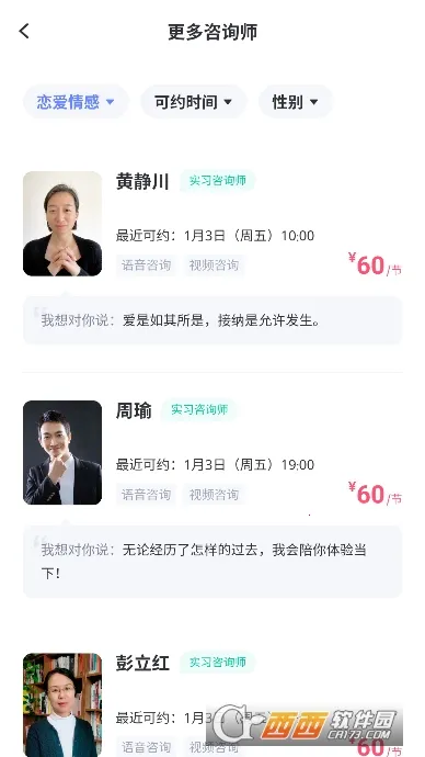 专业权威:平台上的心理咨询师均经过严格评估筛选,确保为用户提供高质量的咨询服务。