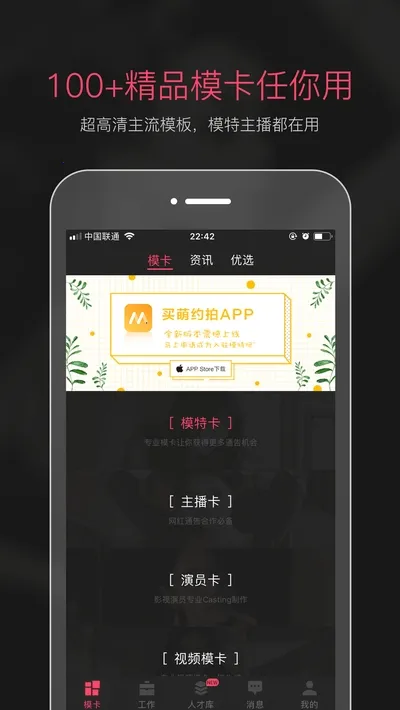 在模卡制作方面,支持极速制作,有海量模卡资源可任意切换,100多种优质主流模版随心选择,能满足不同制作需求,还可生成视频模卡。其优势显著,内置海量模卡信息,方便切换。能极速制作高清模卡,大量真实工作信息可随心预览,便于查找工作。筛选优质模特邀约简单快捷,还能自动生成视频模卡。