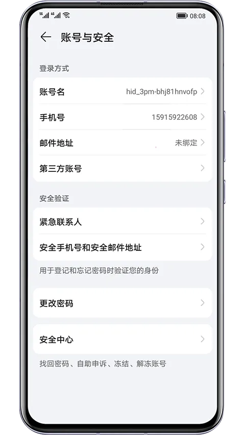 提供多种安全设置,让用户自定义设置安全密码,保障账号信息安全,还支持手动操作推出账号登录,避免其他人使用您的手机进入账号中心。