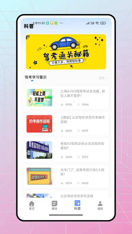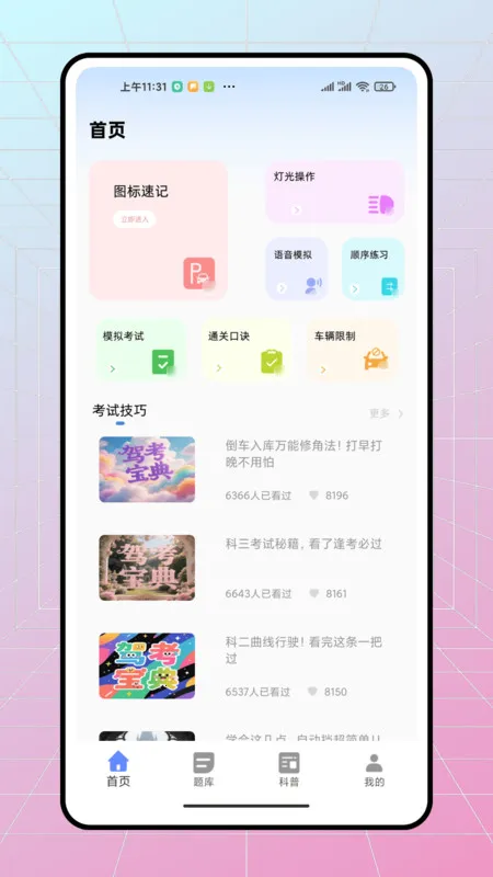 首页呈现图标速记灯光操作等内容及考试技巧分享;题库页面有大量真题与免费网课资源;点击网课可在线学习知识点;科普页面提供驾考警示与知识科普。
