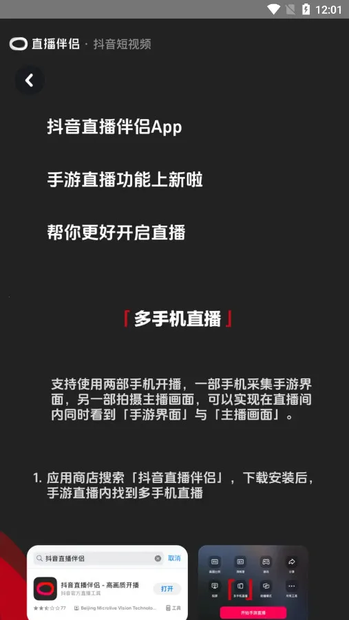 抖音直播伴侣安卓版是抖音官方直播工具,提供高性能高画质直播能力。有专业大屏直播、互动公屏等功能,支持多种直播类型,玩法丰富,一键开播,功能全面,能帮主播更好地进行抖音直播。