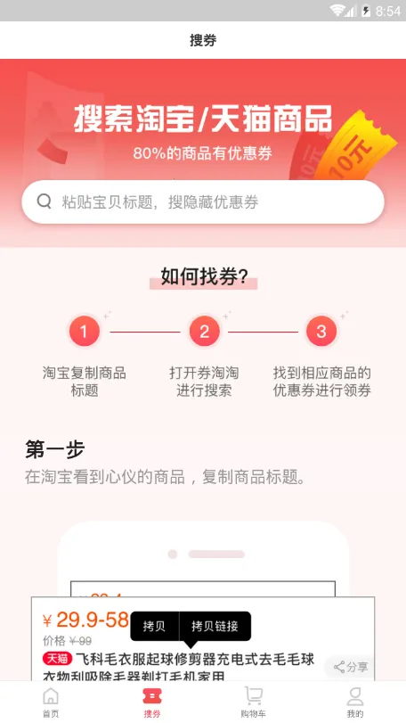 券淘淘2025下载是一款线上电商省钱购物软件,能领主流电商平台红包优惠券,享受折扣优惠,还有高额佣金返利。支持复制标题搜券,有每日签到、本地生活等功能,提供免费省钱工具,助用户轻松购物省钱。