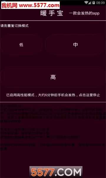 它的功能超实用。能高效发热,通过让手机CPU高负荷运转快速产生热量来暖手。还有智能调节功能,支持多种温度调节模式,可根据自身需求选合适温度档位。能实时监测手机CPU温度和电池温度,确保手机在安全范围运行。采用节能技术,降低能源消耗,延长手机电池使用寿命。而且操作便捷,简约界面无广告打扰,快速上手就能享受温暖体验。