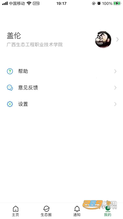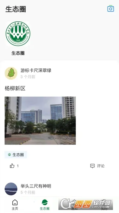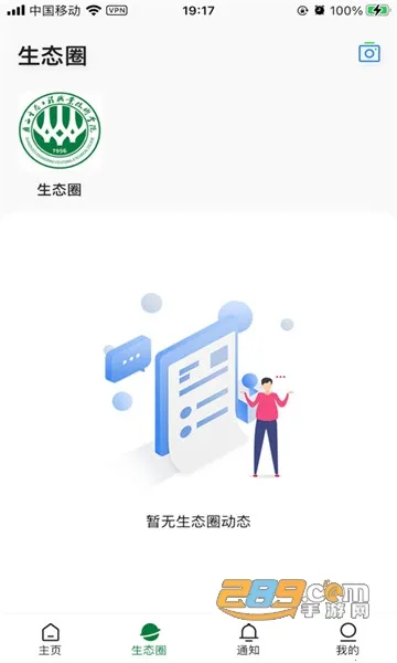 打开 App 默认进入首页,可点击图标进入 e 码通、公告等模块,最下方首页按钮可随时回到主页总览。点击底部生态圈按钮,可浏览校内师生发布的动态,支持点赞与评论,打造轻量社交的校园交流空间。切换至通知页面后可查看学校应用与生态圈的各类通知提醒,未读消息会按分类显示,方便追踪。点击右下角我的菜单可进入个人中心,查看意见反馈入口与设置功能,支持修改资料与账户管理等操作。