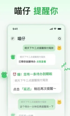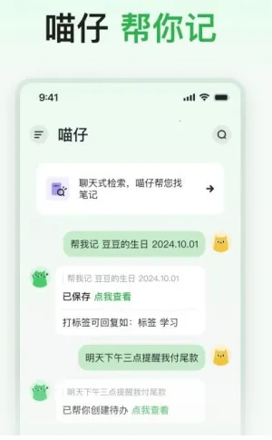 其特色也很突出。萌系AI互动,可爱猫咪形象的AI助理超萌,能处理笔记、待办,还能陪用户聊天。聊天式操作将多种功能融入聊天交互,简便易上手。功能集成便捷,集笔记收集、整理、待办提醒、智能检索等功能于一体。
