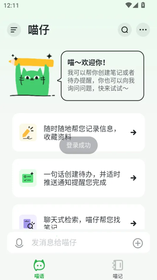 喵记多是北京轻雀科技有限公司开发的AI笔记应用软件。它将AI融入笔记记录与管理,有智能笔记、待办管理等功能。用户能与猫咪AI助理喵仔聊天互动,轻松查找笔记,满足学习、工作等场景下的记录需求。
