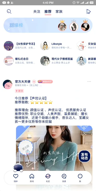 宇宙奶茶馆安卓版是女性友好的虚拟社交平台,致力于打造安全环境,女性可自主设置打招呼权限。软件功能丰富,有早起叫醒、连麦哄睡等多种陪伴服务,助用户轻松社交、释放情绪、结交好友 。