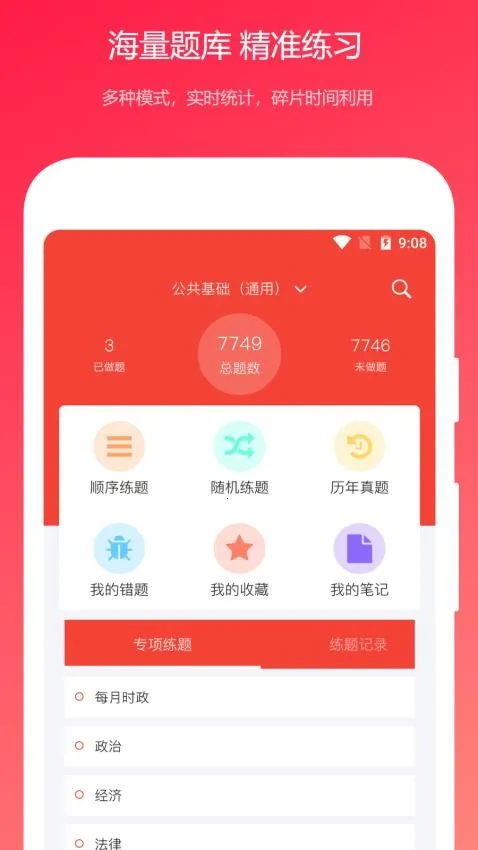 这里有海量试题,覆盖公共基础知识各个方面,帮你构建完整知识框架。每道题都配有详细解析,助你掌握解题技巧。它有顺序练习、随机练习、历年真题等多种练习模式,还能智能整理错题,方便反复巩固。你可以随时收藏难题,也能查看他人笔记。而且支持离线刷题,充分利用碎片化时间。无论是初学者巩固基础,还是考前冲刺突破,它都能提供个性化备考支持。软件紧跟考试大纲,题库更新快,让你第一时间接触最新考点。有了它,备考更高效便捷,快来下载体验吧!