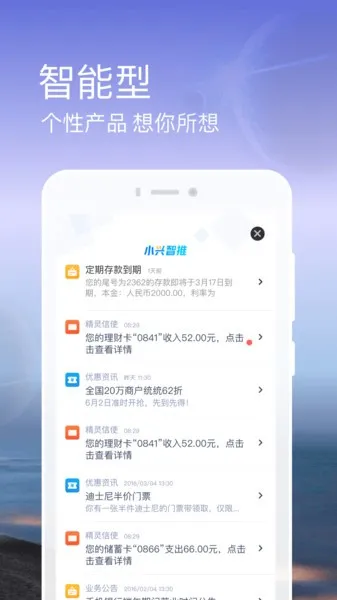 提供贴身金融服务,涵盖查询转账、投资理财、信用卡等方面。查询转账功能多样,手续费优惠、到账快且安全便捷;投资理财产品丰富,首家提供黄金现货等延期交易,有一站式贵金属服务;信用卡产品丰富,特色鲜明,如业界首推手机银行信用卡账单分期等服务。