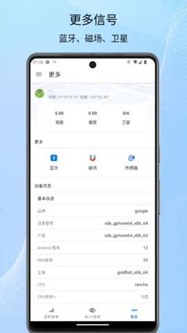 在 GPS 信号检测方面,可获取卫星国籍名称、数量、实时位置、是否可用、经纬度和地址等详细信息。蓝牙信号检测能实时显示强度,并获取连接设备的 MAC 地址。WIFI 信号检测可查询强度、MAC 地址、信道、IP 配置、连接速率等,还能进行安全性检测。手机信号检测能查强度、SIM 卡信息、运营商及基站位置等。
