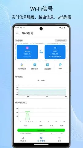 信号检测仪是一款超实用的手机辅助软件。它能实时检测多种信号,像GPS、蓝牙、WIFI、手机信号等。检测GPS信号时,能获取卫星的国籍名称、数量、实时位置、经纬度等详细信息;检测蓝牙信号可了解连接状态和强度;检测WIFI信号能知晓强度、MAC地址、信道等信息,还能进行安全性检测。它还能显示设备速度、海拔坐标等,支持路由追踪和PING测试。有了它,用户能轻松定位最佳信号位置,比如找到最强WIFI信号,让上网更顺畅。还能保障网络安全,比如通过WIFI安全检测避免风险。操作简单,界面简洁,无需专业知识就能上手。当信号异常时会及时提醒,避免影响使用。无论是普通用户想了解信号情况,还是专业人士有相关需求,它都是很实用的工具。
