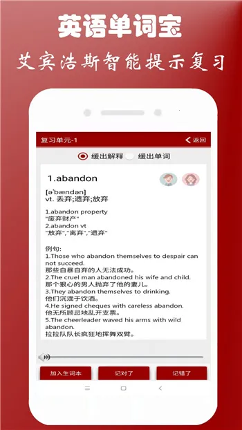 1、**科学记忆**:依据艾宾浩斯记忆曲线,科学系统地安排复习计划,定时提醒复习学过的单词,帮助您轻松、高效、长久地掌握所需单词。