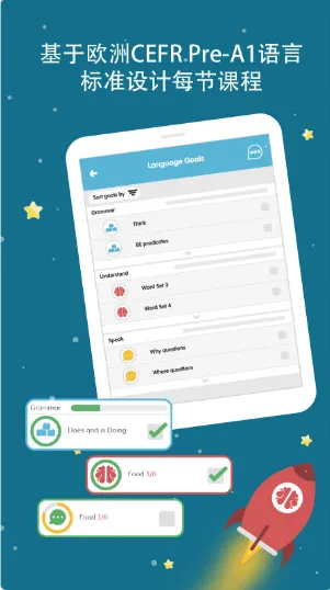 4、课程设计科学:根据英语牛津大学剑桥大学等英语启蒙的研究和欧洲CEFRPre - A1语言标准设计每节课程,每天学习10分钟,课程内容循序渐进,包含常用名词、形容词、动词及造句练习。
