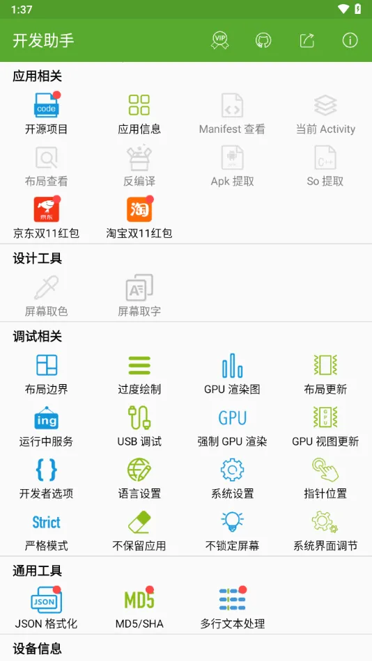 开发助手是一款强大的安卓开发工具,能实时查看应用布局、数据、系统日志,检测bug。可反编译应用,提取文件,查看开源项目,快速开关开发者选项,还能取色、查信息,功能丰富实用,助开发者高效开发。