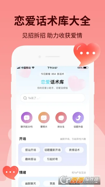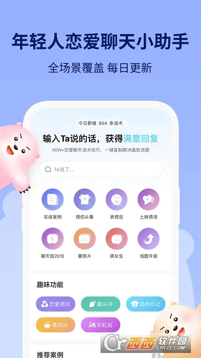 2. 恋爱话术超丰富:拥有成千上万可搜索的恋爱聊天话术,全场景覆盖且持续更新。能一键搜索获得众多高情商回复,告别尬聊。
