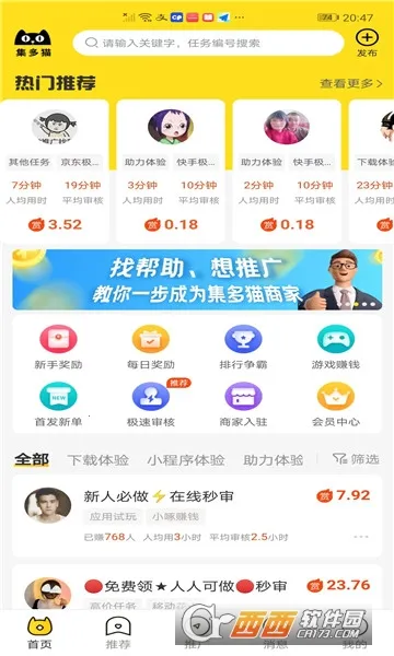 集多猫是一款能帮咱赚钱的APP。它有海量任务,像试玩、点赞、转发文章、投票等,类型丰富。任务简单好做,每天都会更新,做之前还会明确标价,做多少自己能算出来。新人无门槛加入,有手机就能做任务赚零花钱。软件会保留任务数据,任务单价5到10元单,完成雇主要求就能得赏金,每月在家能入千元。而且玩游戏还有大礼包。它由悬赏猫全新更名而来,任务多,提取门槛低到账快。下载安装后有新人活动奖励和每日奖励活动。直接在任务大厅就能免费自由领取各种任务。另外平台还有新手奖励、每日奖励、排行争霸奖励等福利活动,满2元即可申请提取,到账迅速。总之,集多猫赚钱是真的,也比较安全可靠,想赚钱的伙伴可以试试。