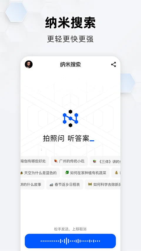 360纳米搜索是一款创新型AI搜索产品。它支持文字、语音、拍照、视频等多种搜索方式,语音输入在不方便打字时很实用,拍照搜索可识别物体获取信息。
