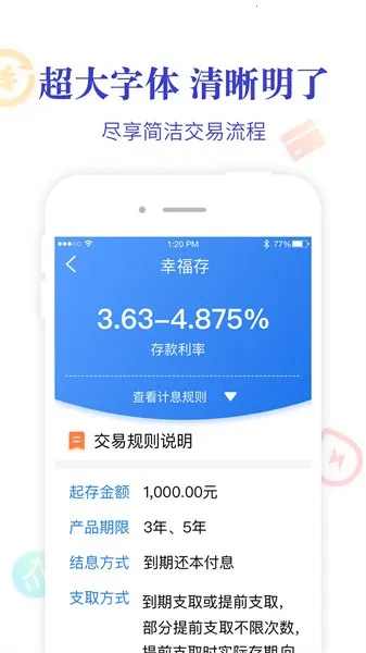 3. 功能丰富超便捷:集在线办理定期投资理财、生活缴费、手机充值、无卡取款、线上申请贷款、线上还款、医保缴费等便民业务为一体,业务通知能及时知晓每一笔收支,随时随地掌握资金动态。