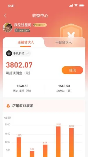 3. 收益管理透明:合伙人佣金以可视化图表动态展示收益构成与增长趋势,支持快速提现至个人绑定账户,清晰透明。