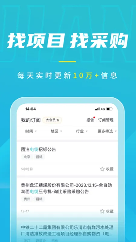 海量信息免费开放:招标信息来源于全国6700家政府和企业招标网站,日新增10万条数据,每天向订阅用户推送1500万条。全国范围内的招标采购信息无限量开放,用户无需担心内容屏蔽或收费,所有项目信息均免费查看。