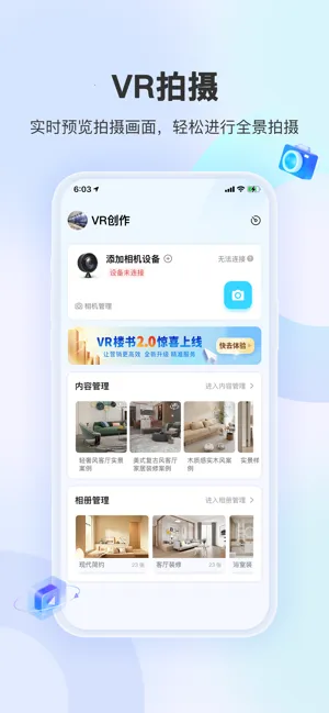 4. 功能全面强大:其中所提供的VR创作辅助功能十分全面,能帮助用户更好地创作VR全景视频,还有便捷沟通工具等,全方位满足装修行业需求。