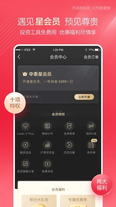 中泰齐富通是中泰证券旗下的股票证券炒股理财投资平台,提供证券开户、股票交易等丰富功能。有724小时在线极速开户、闪电下单,近百种决策工具,还能实时推送资讯,支持多类业务在线自助办理。