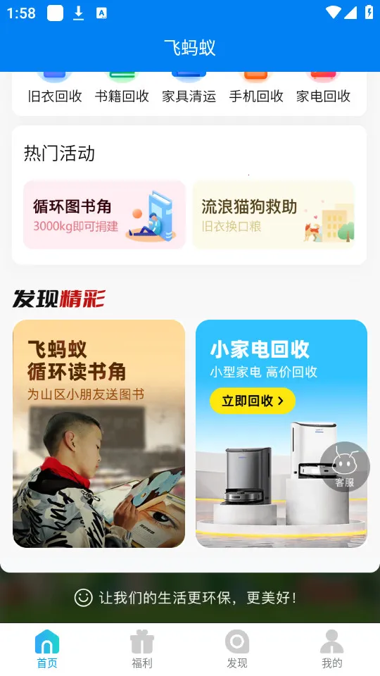 一键免费预约上门服务,各类回收服务,高品质服务保障:300城市可一键预约免费上门回收,覆盖旧书回收、旧衣捐赠等内容,回收服务品质高。