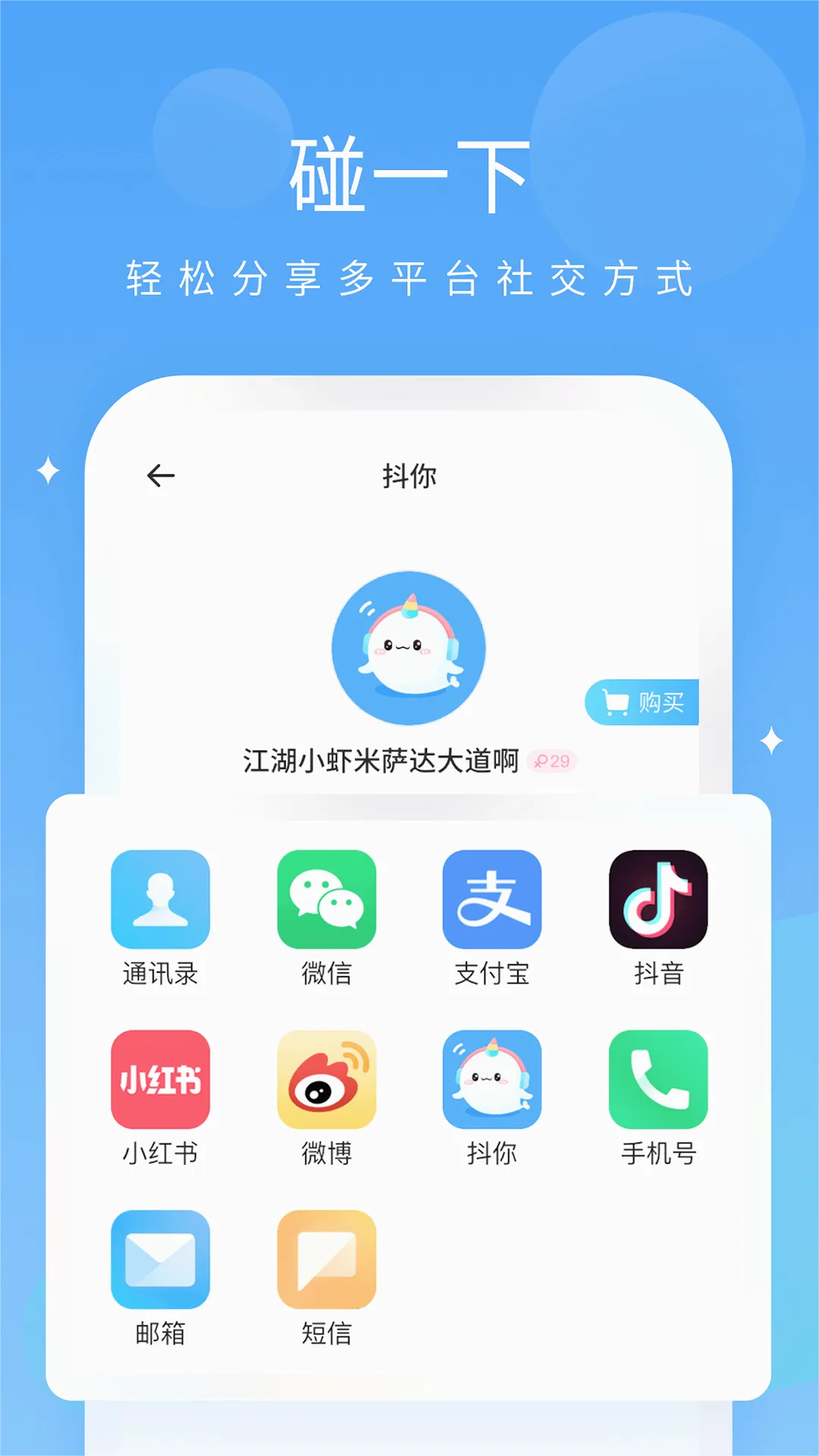 抖你是一款集数字名片夹一键分享与多平台社交入口于一体的智能社交工具。它将微信、QQ、抖音等账号整合为电子名片,碰一碰或扫二维码就能交换信息。