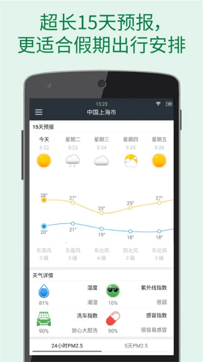 其定位精准到街道级,数据更新速度极快,每分钟更新一次,能让用户及时掌握最新天气动态。分钟级预报可准确预报几点几分下雨,还有下雨前2小时提醒,实用性很强。常规数据全面,涵盖实时天气温度、风力风向、湿度、紫外线、小时天气、15天天气等,甚至有100个国家的空气质量指数预报以及未来24小时、5天的湿度预报,能区分云量多少,还有台风实时路径图。