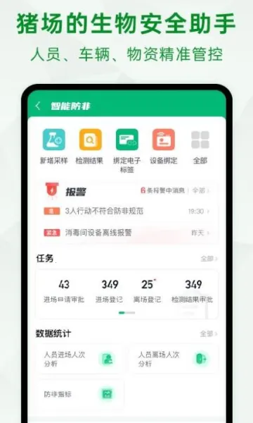 任务影子智能引擎依猪只生产规律自动推送任务,工作人员能实时知晓工作内容并采集数据。报警管理针对异常状况提供预警、报警及解决方案。通过它能更好管理猪场,保障猪只健康与食品安全,提升管理效率,助力猪场科学运营。