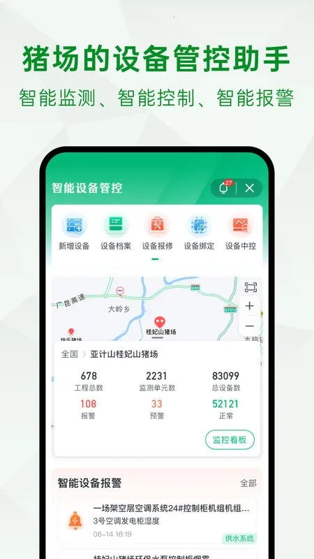 3、针对猪场的猪只、设备、任务指标和环境等异常状况,提供预警和报警功能,并提供解决方案,助力及时发现和解决问题。