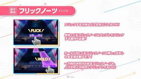关于滑动方向的紫色FLICK音符,除极少数情况下有指定方向,基本上所有FLICK音符可以往任意方向滑动。 而长按的青白色「HOLD」音符,即使最一开始 MISS,只要途中有按到最后也没有问题,更可更换按住的手指。
