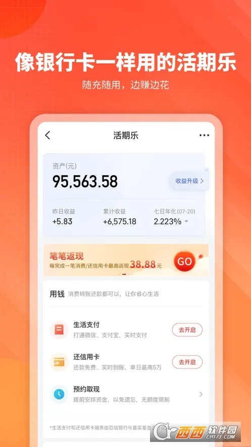 2、理财功能全:支持一键管理交易记录、信用卡还款等,还提供多种理财产品,如货币基金、债券基金、指数基金、股票基金等,满足全方位理财需求。