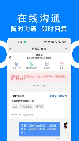 想知道同城招聘靠不靠谱?快来了解这款同城招聘应用!它可是求职者与雇主的得力助手。这里有海量招聘信息,各行业全覆盖,实时更新,任你挑选。不仅能免费发布招聘信息,还能在线便捷管理多个简历。对于求职者来说,能快速浏览本地最新招聘,智能匹配节省时间精力,心仪工作随时推送,还能通过企业视频了解工作内容与环境,甚至视频面试确定上班时间,真正做到不接触招聘,省时省心。应届毕业生或失业人群也能轻松线上去找工作。板块画风详细,可直接选招聘或找工作板块。还能收藏、订阅感兴趣岗位信息。有了它,求职招聘更高效便利,能帮你解决找工作的诸多问题,是个值得信赖的同城求职好帮手,赶紧来下载体验吧!