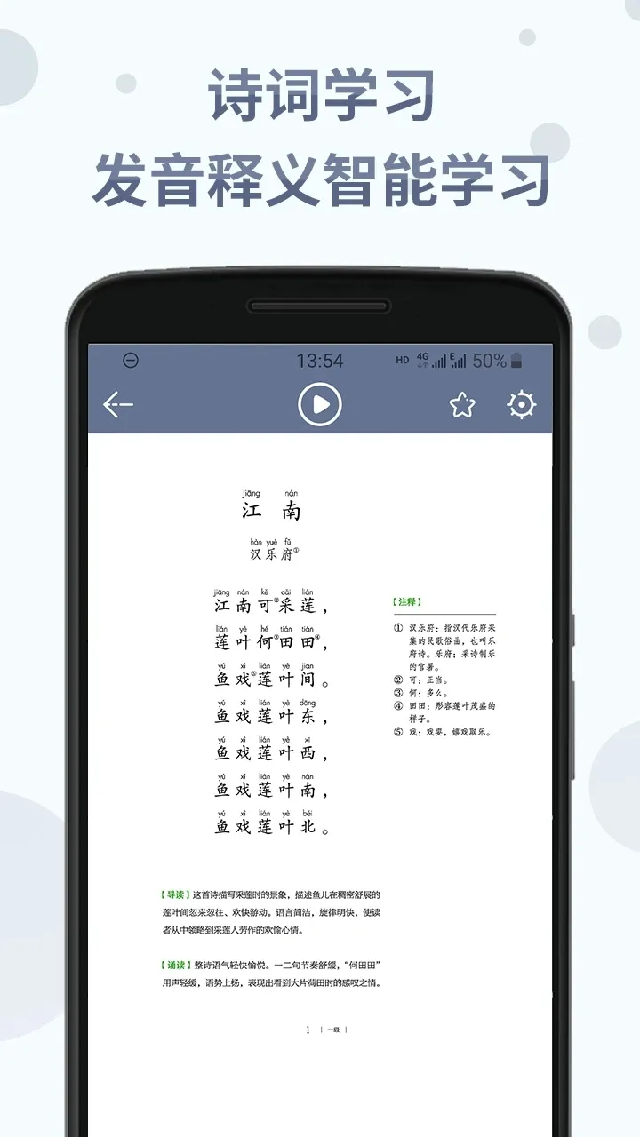 每首诗都配有拼音,能告知用户正确发音,帮助更好地诵读诗词。