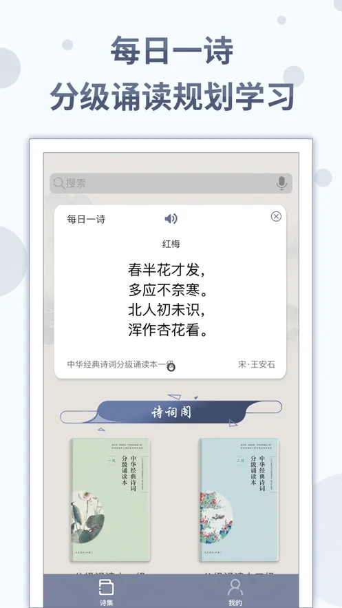 诗词分级诵读app由人民教育电子音像出版社打造,专为中小学生设计。收录大量诗词,有详细讲解注释。具备查诗、释意、测发音等功能,支持语速调节、智能测评,还能每日一诗、快捷收藏,助力诗词学习。